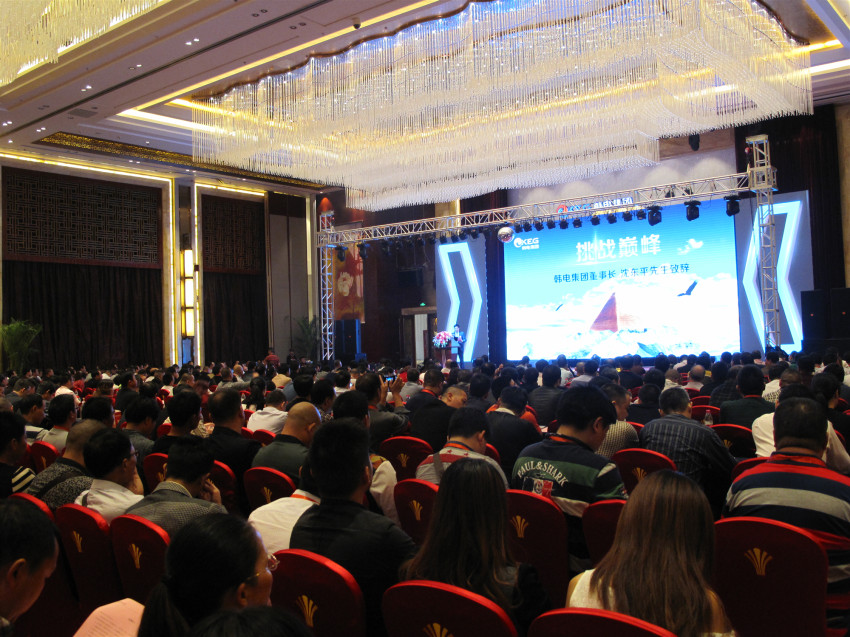 2014年10月26日,“变革突破、逆风飞扬”韩电集团2015年度冰箱、空调、冷柜开盘盛会在杭州湾世纪金源大饭店隆重举行。本次大会规模空前,出席会议的有集团董事长沈东平,集团总裁沈凯峰,冰箱、冷柜、空调三军负责人及各位奋战在各路前线的销售、售后、后勤等“机要人员”,共计千余人。