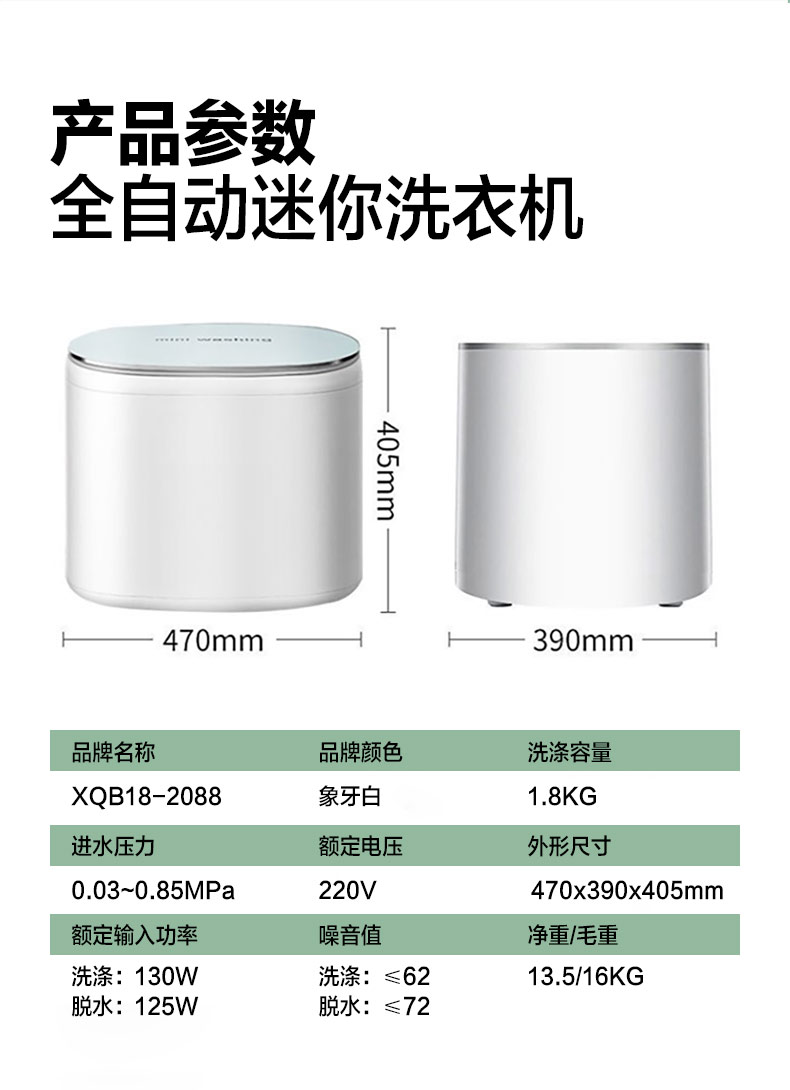 产品描述:韩电1.8公斤迷你洗衣机还具备高温煮洗、杀菌功能,能在小巧便捷的同时为衣物带来高效清洁与健康呵护。